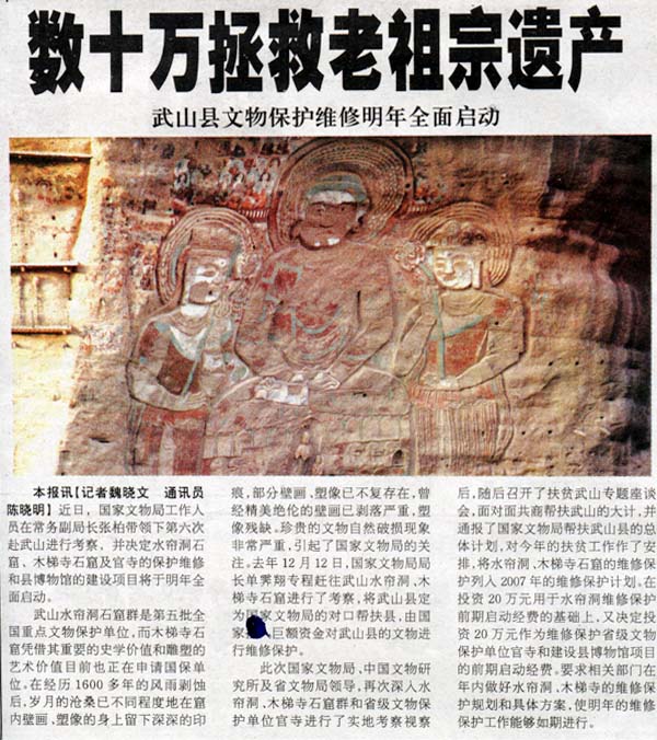 本报讯【记者魏晓文 通讯员陈晓明】近日,国家文物局工作人员在常务副局长张柏带领下第六次赴武山进行考察,并决定水帘洞石窟、木梯寺石窟及官寺的保护维修和县博物馆的建设项目将于明年全面启动。