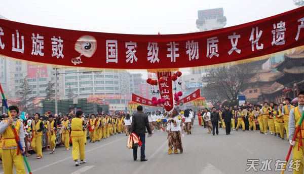 银猪随瑞雪笑去,金鼠伴奥运奔来,在我们满怀丰收的喜悦迎来又一个美丽春天的日子里,武山旋鼓应北京市历代帝王管理处和北京市西城区文化管理委员会邀请,于2月6日进京交流表演后,2月18日,在武山县委常委宣传部长郭海军、副县长吴方勇的带领下参加了天水市2008年春节社火文艺节目调演。