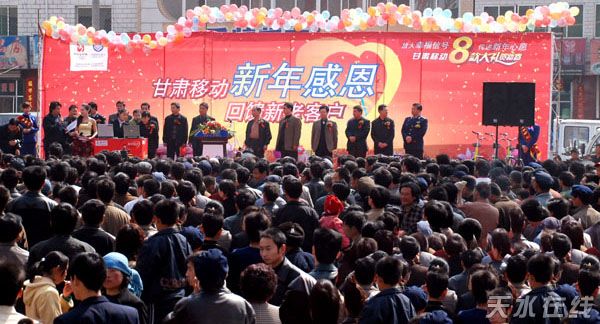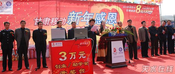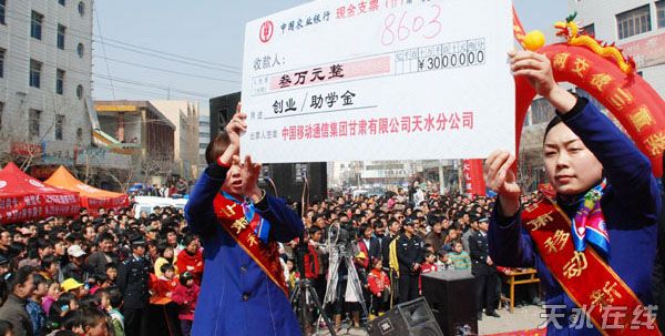 3月9日,天水移动通信分公司在武山县洛门镇举行甘肃移动新年感恩回报新老客户3万元创业/助学金抽奖活动。秦安县兴国镇手机尾号为8603的一位女士喜中3万元“创业/助学金”大奖。截至3月7日,全市已抽出3万元创业/助学金客户3名,一等奖256名,二等奖755名,三等奖12677名。