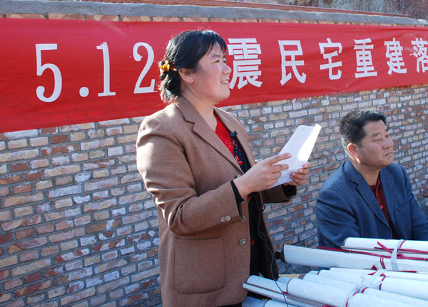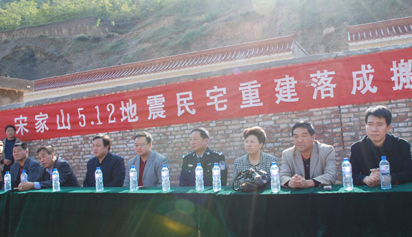 副县长纪永安代表县四大组织作了致辞,对工程的竣工和村民们的顺利入住表示热烈的祝贺!他说,工程的竣工和受灾群众的顺利入住,凝聚着党和政府的温暖,凝聚着市、县相关帮扶单位及社会各界对鲁班村宋家山组广大父老乡亲的关爱和支持,标志着宋家山群众灾后自救和恢复重建生产工作取得了阶段性胜利,也促进了全县灾后恢复重建工作的有力、有序、有效开展。他强调,有县委、县政府的坚强领导,有帮建单位和社会各界的鼎力相助,通过全体村民的共同努力,宋家山就一定能够成为全县山区灾后重建异地搬迁,建设美好家园的典范。