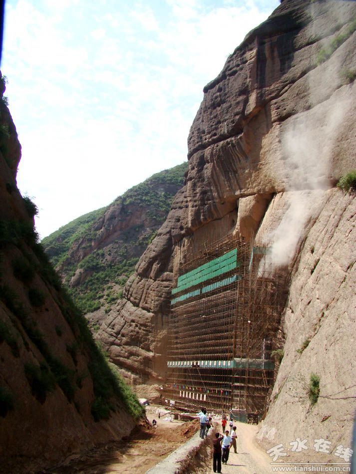 10月10日记者在武山水帘洞,采访施工现场技术人员时了解到,由于武山水帘洞石窟群属丹霞地貌沙砾岩体在长期的地质和自然作用下裂隙发育加之岩层渗水及雨水侵蚀使依附于其上的文物生存环境日趋恶劣。