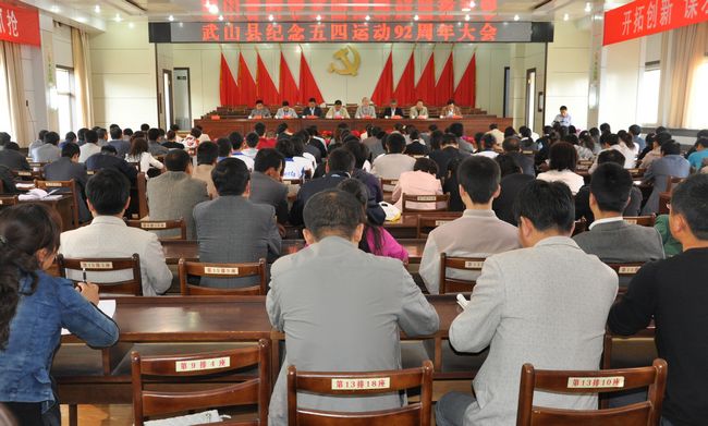 5月4日,武山县召开大会纪念“五四”运动92周年。团市委副书记张兴出席会议。武山县委常委组织部长王永刚、县人大常委会副主任麻保禄、县政府副县长丁晓来、县政协副主席马进出席会议。会议由团县委副书记白江开主持。会议全面总结了2010年全县共青团工作,表彰奖励了2010年度优秀团组织、团员、青年志愿者。