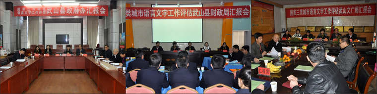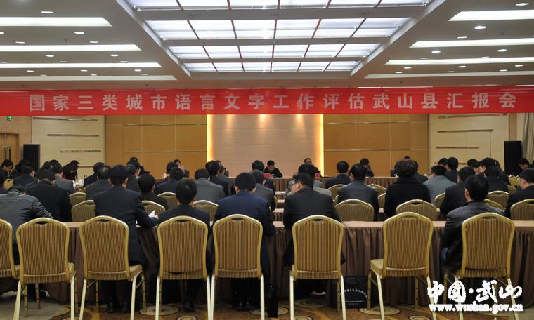 汇报会上,索鸿宾代表县四大组织向与会的各位领导、各位专家、各位来宾表示热烈的欢迎,对多年来关心、支持武山经济社会发展的各级领导、各界人士表示衷心的感谢。他说,近年来,武山县委、县政府高度重视言文字工作,把语言文字工作列入重要议事日程,在推广普通话、推行规范汉字方面,认真贯彻执行《中华人民共和国通用语言文字法》和《甘肃省国家通用语言文字条例》,按照“一个目标(构建和谐语言生活)、两条腿走路(基础工作、开拓新领域)、三个结合(与文化、教育、信息相结合)、四项任务(建设、推广、监督、服务)”的语言文字工作思路,不断加强宣传教育,完善保障机制,强化监督管理,坚持以党政机关为龙头,以学校为基础,以新闻媒体为榜样,以公共服务行业为窗口,通过宣传动员、目标管理、量化评估、普通话培训测试、强化监管以及推普周活动等措施,使全县语言文字工作环境和水平有了明显提升,良好的语言文字环境正在形成。