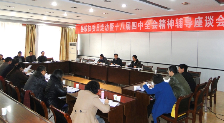 为进一步增强委员学习贯彻党的十八届四中全会精神的自觉性,全面了解一年来的履职情况,为召开县政协八届四次会议做好充分准备,近日,武山县政协4位副主席分别带领专委办人员,采取集中座谈和上门走访相结合的方式,对委员进行了普遍走访,并辅导学习了十八届四中全会精神。