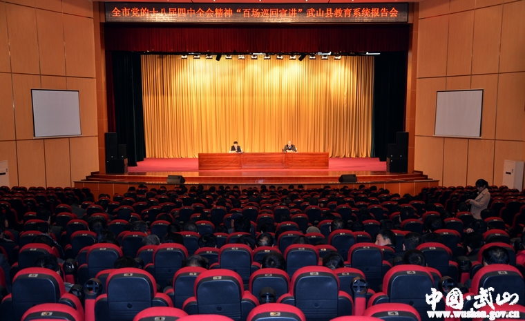 12月23日,全市党的十八届四中全会精神“百场巡回宣讲”武山县教育系统报告会在县文化中心礼堂举行。报告邀请市公安局政治部主任王兰平主讲,教体局领导班子全体成员、全县完全小学以上学校校长、书记,城区中小学校所有班子成员,教体局机关各股室负责人共计300余人聆听宣讲。