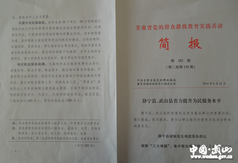 2014年2月20日,武山县党的群众路线教育实践活动全面启动,全县4个县级领导班子、40名县级干部,87个科级领导班子、824名科级干部,497个基层党组织、17968名党员以为民务实清廉为主题,按照“照镜子、正衣冠、洗洗澡、治治病”的总要求,涤作风之弊、祛行为之垢、立为民之制,党员干部作风明显改进,政风民风明显好转,干群关系明显改善,武山县教育实践活动正汇聚起巨大的正能量,为全县凝心聚力推动改革发展注入强大动力。