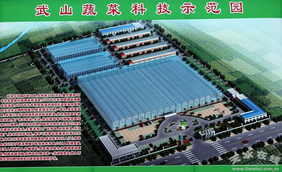 武山蔬菜科技示范园区总面积4100亩,主要包括工厂化育苗中心、国家级洛门蔬菜批发市场、蔬菜冷链物流区和示范种植区。园区按照“政府主导、统一规划、分片建设,组团发展,企业化运营”的思路,集中打造集科技推广、示范引导、集约化育苗、技术培训、农业观光为一体,省内一流、国内领先的高科技产业示范园。其中核心区预计年可培育优质蔬菜壮苗1.2亿株,提供5万多亩蔬菜种植用苗,培训菜农6万人(次),辐射带动全县5万多户蔬菜种植户实现技术升级,蔬菜产量和产值每亩提高20%,全县22万人将直接受益。