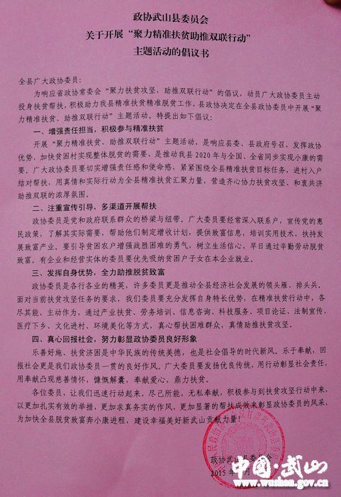 6月19日,武山县政协主席李晓东、副主席骆育喜带领部分机关干部,再次深入新增双联点滩歌镇野峪村调研精准扶贫工作,并向全县政协委员发出倡议,正式启动县政协委员“聚力精准扶贫助推双联行动”主题活动。