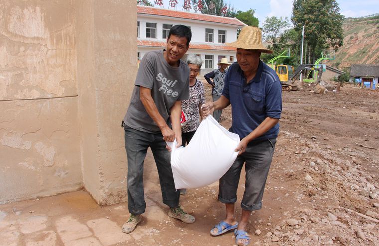 为群众发放米面油等救灾物资