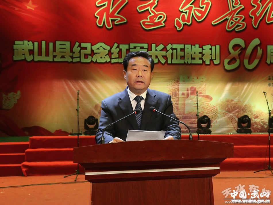 在晚会上,索鸿宾代表县四大组织向所有为武山革命事业作出贡献的老红军、老同志、老干部及其家属,致以崇高的敬意,向为武山经济社会发展贡献力量的社会各界人士表示衷心的感谢。他说,长征是一部中国共产党和中央红军气吞山河的壮丽史诗,是中国历史和世界军事史上无与伦比的辉煌篇章。武山是一片红色热土,有着光荣的革命传统和丰富的党史资源,是中国工农红军二万五千里长征途径的重要地区之一。从1935年9月25日至1936年10月11日,毛泽东、周恩来、朱德等老一辈革命家率领中国工农红军第一、二、四方面军主力部队先后经过武山,毛泽东在鸳鸯镇费家山费孝忠家宿营一夜,红军部队积极宣传党的政治主张和抗日救国真理,领导开展农民运动,发展党的组织,建立了中共山丹区委和陇右最早的红色政权——武山县苏维埃政府。在先后驻扎转战的40多天时间里,广大红军指战员浴血奋战、英勇斗争,用鲜血和生命在武山的大地上留下了北上抗日、救国救民的红色印记,播撒了星火燎原、持久不息的革命火种,谱写了波澜壮阔、可歌可泣的壮丽篇章。长征精神作为中国共产党人的红色基因和精神族谱的重要组成部门,已经深深融入中华民族的血脉和灵魂。那段艰苦而光辉的岁月,那种无畏而坚定的信念,那种英勇而伟大的精神,一直激发着武山人民投身革命事业、建设美好家园的壮志豪情,永远激励我们战胜困难、勇往直前。长期以来,一代又一代富有光荣革命传统的武山儿女,凭着这种精神,用智慧和汗水迎接一个又一个挑战,战胜了一个又一个困难,开创了武山各项事业的新局面,谱写了武山发展史上的崭新篇章。