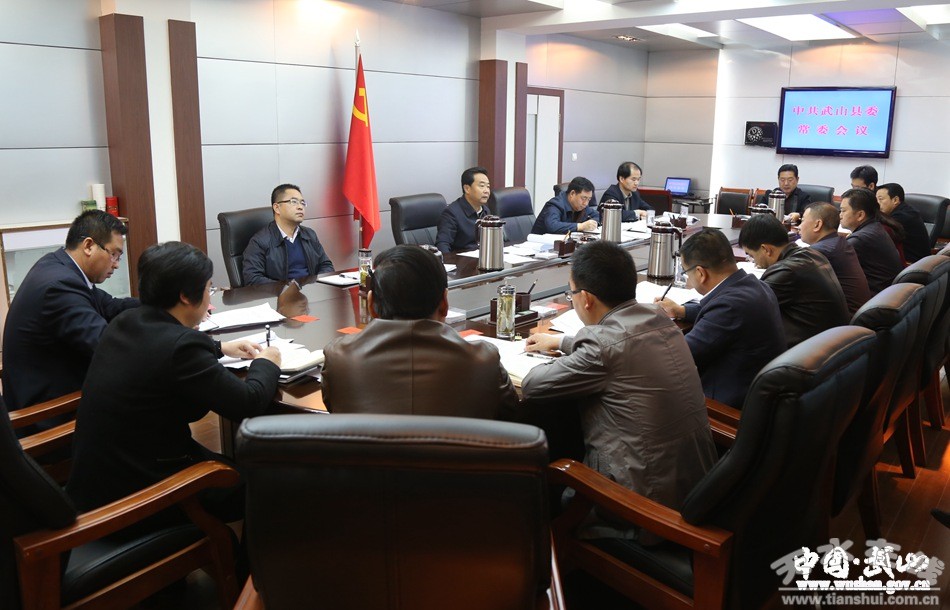 11月16日,武山县委书记索鸿宾主持召开县委常委会会议,传达学习省委办公厅《关于认真学习贯彻党的十八届六中全会精神深入查摆全面从严治党方面存在的问题的通知》精神;听取2016年民生实事办理及民生政策落实情况的汇报;讨论研究县第十四次党代会重点工作任务分解、武山县脱贫攻坚领导小组调整、贫困退出验收指标责任分解、武山县脱贫攻坚督查巡查工作实施办法、天水市创建全国质量强市示范城市武山县工作方案、2016年度部分乡镇和县直部门党政主要负责人向县委和县纪委“三述”工作、县委反腐败协调领导小组组成人员调整等事宜。