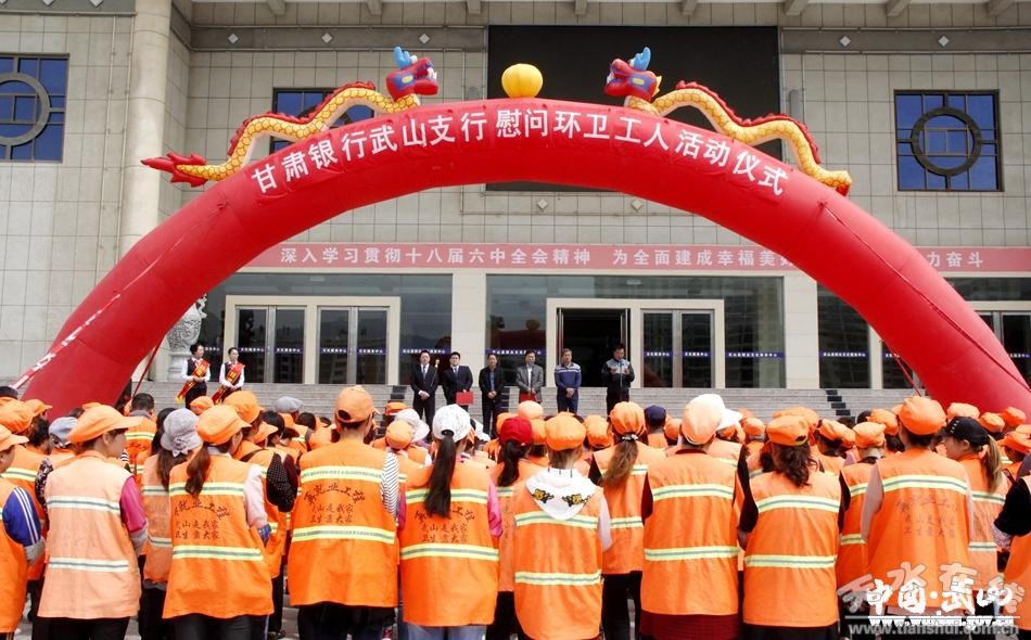 5月24日,武山县在群众文化活动中心广场举行慰问环卫工人活动。县委常委、副县长何敬忠,县政协副主席骆育喜出席慰问活动。甘肃银行武山支行行长刘伟及县建设局负责人参加慰问活动。甘肃银行武山支行为全县302名环卫工人送去了价值4万多元的米、面、油等物资。
