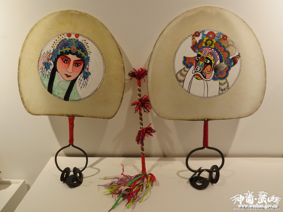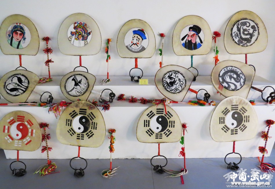 武山旋鼓历史悠久,据考证,扇鼓由周朝的大鼙、汉魏鼙鼓而来,《乐府诗采》卷五十三《魏陈思王鼙鼓歌·序》引《古今乐寻》:“鞞舞,染谓之鞞扇舞……鞞扇,器名。”“鞞扇”就是今天的扇鼓。武山旋鼓叫扇鼓或鼙鼓,始于汉,兴于宋,盛于明。曹植《鼙舞歌》中有“乐人舞鼙鼓,百官雷林赞若惊”之句,扇鼓形似扇、又似芭蕉,边以铁铸成,面蒙去毛羊皮,手柄“硬三环套小九环”,成“九连环”。羊皮鼓(扇鼓)由三环九叶组成,以铁圈为箍,扇面直径一般在30厘米左右,厚度一毫米,薄如蝉翼,鼓面绘有图案,多为八卦图。鼓柄外部多用布条缠绕,将鼓圈与鼓环连接在一起。鼓环上套着三个小钢环,称为“九连环”,鼓动时相互碰撞,发出清脆悦耳的响声,鼓槌用皮条编拧而成,并套缠花纹缨穗。鼓的形状独特、精致、美观,富有厚重的传统韵味。
