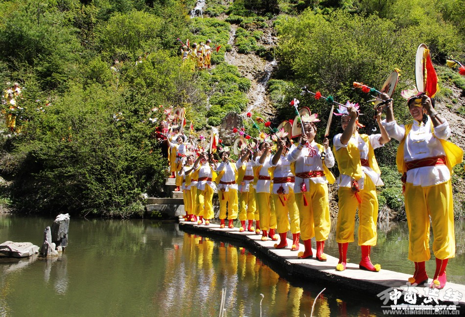 打鼓时,鼓手头戴六瓣青白小帽,身穿围兜、灯笼裤,外套羊皮马甲,脚蹬麻线鞋,身背三色小旗,组成50到100人的鼓队,围绕着高五丈、顶有仙女骑鹤、中缠云龙,吊有串串花团,围着八仙、二十四孝、福禄寿等的纸幡,鼓手左手举鼓,右手执鞭,边舞边打,鼓声铿锵,坠环“嚓嚓”。传说古时,武山森林茂密,狼群出没,恶兽成群,农历四五月份,狼群正出天花,乡民集结打鼓,鼓声震天撼地,震死狼仔,震跑野兽,从而形成了武山旋鼓。