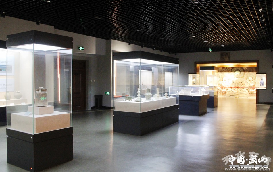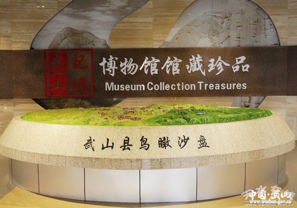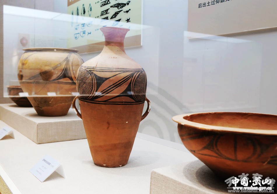 9.武山县博物馆是我县唯一的国有文物收藏单位,各类文物及标本5000多件,古钱币2万余枚,有珍贵文物近200余件(一级6件、二级32件)。博物馆藏品中200多万年前的剑齿象化石、披毛犀化石,旧石器时代的“武山人”头骨化石,新石器时代的陶器(尤以石岭下彩陶驰名中外,鲵鱼纹彩陶瓶纹饰中的“鲵鱼”是中华远古龙图腾最早的祖形;变体鸟头纹彩陶瓮“变体鸟头纹”是我国新石器时期唯一具有凤凰鸟“三羽冠”特征的纹饰,因此被学界认为是中华凤文化的最早雏形),战国时的青铜器,汉代陶庄院,唐代鎏金镶银铜碗、凤首壶,宋金彩绘、模印画像砖,元代琉璃舍利塔,明清佛教造像等都是本馆特色鲜明的藏品。武山博物馆收藏有近现代名人董必武、郭沫若、胡厥文、启功、潘天寿、沙孟海等人的85件套书画作品(其中康务学先生捐赠的有73件套)。这些地域文化浓厚,数量众多、种类齐全的藏品,从各个不同的角度反映了古代先祖在这块土地上居住生活、繁衍生息的奋斗历程,是研究武山乃至渭河流域历史的重要实物资料。