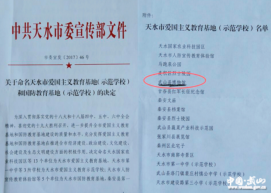 日前,武山县博物馆被天水市委宣传部命名为市级爱国主义教育基地。