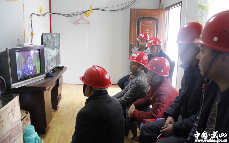 (武山县信用联社业务楼项目工地建筑工人收看党的十九大开幕会实况)