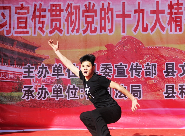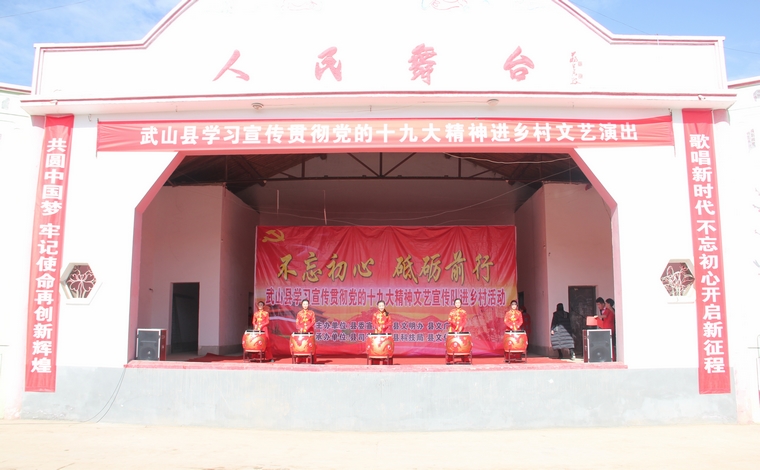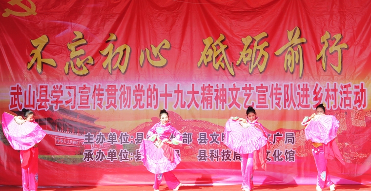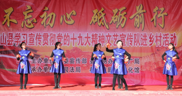 文艺宣传队进乡村活动由县委宣传部、县文明办、县文广局主办,县司法局、县科技局、县文化馆承办,主要通过文艺演出、展板展示、资料发放、书籍赠送、现场交流等方式, 深入推进党的十九大精神进农村,用群众喜闻乐见的形式宣传党的十九大精神,让党的十九大精神和习近平新时代中国特色社会主义思想深入基层、深入群众、深入人心,进一步激发全县干部群众干事创业的积极性。文艺宣传演出中,精心创排的《美丽中国》、《家乡走进新时代》、《欢天喜地》等主题节目表演赢得了现场观众的阵阵掌声,让广大群众在潜移默化当中接受了学习教育,在轻松愉快的节目氛围中理解领会了党的十九大精神。