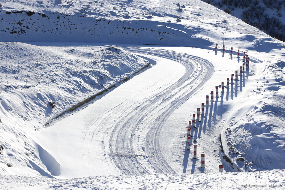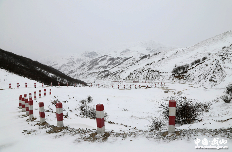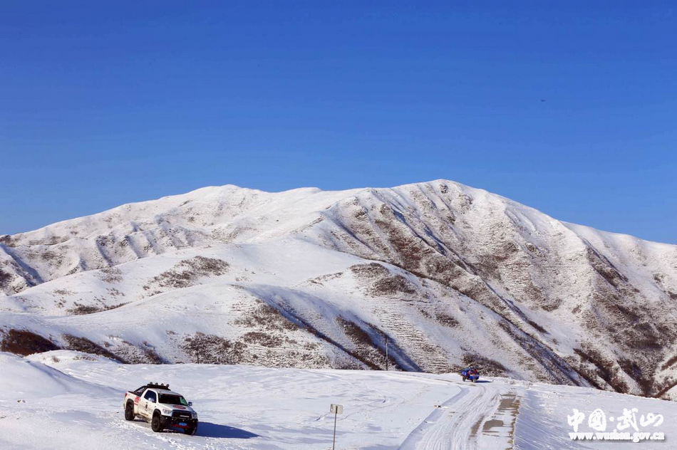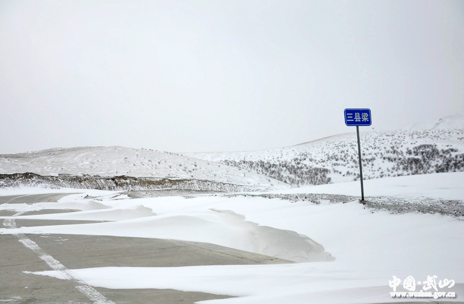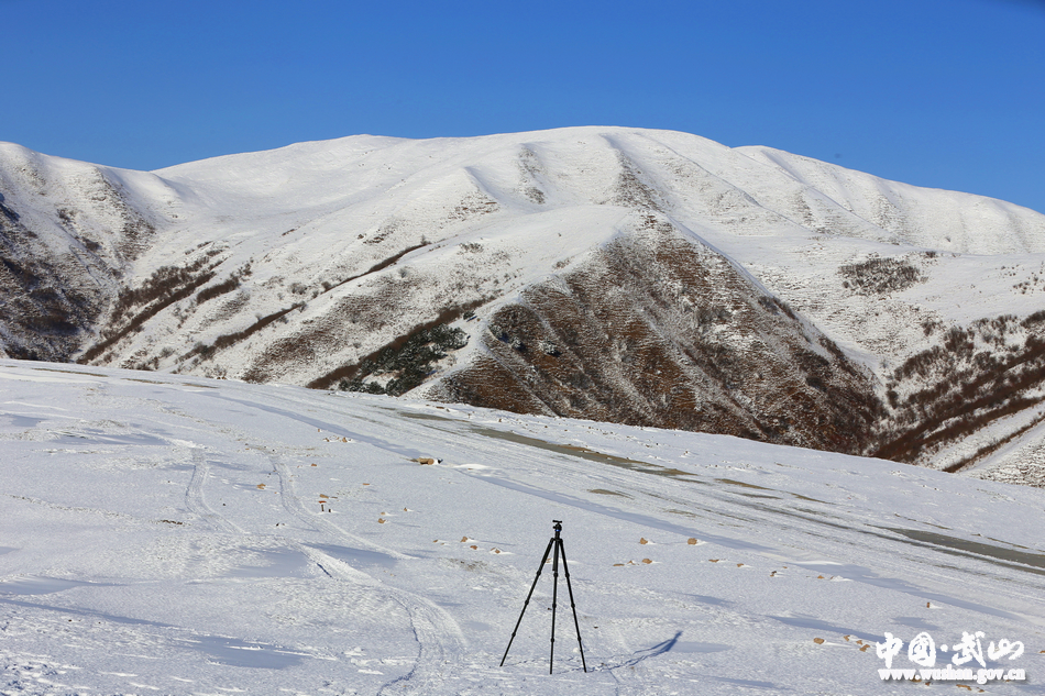 雪天采风,得装备良好的车辆。沿着草川旅游公路前行,一路上也颇多乐趣,尤以三县梁附近的风景为最。蹒跚而上的旅游公路将大草原一分两半,山阴山阳自成风景,山阴处白雪皑皑人迹罕至,寂静阒然,信步踏上厚厚的积雪,咯吱吱的歌声里,留下一串串清晰的足印,便又是另一番风情。山之阳,阳光照耀下,白雪熠熠生辉,消融后露出的地表、草木,深深浅浅点缀在雪原上,恰若白色的帷幕上排排行走的黑色羔羊,黑白甚是分明。