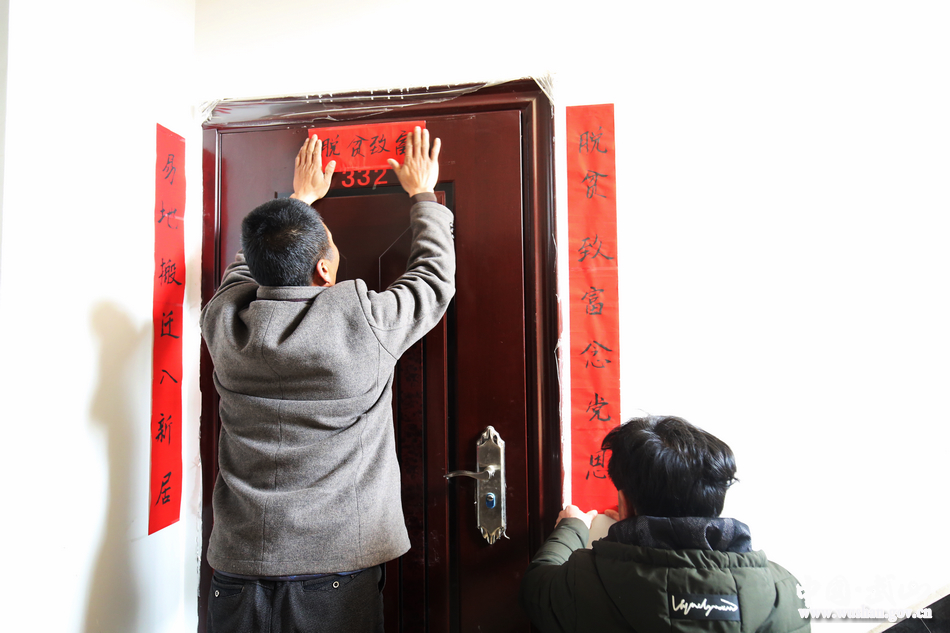 “易地搬迁入新居 脱贫致富念党恩”,红艳艳的对联,端端正正分列门两边。墨汁饱满淋漓的大红福字贴在门正中间,便有了几分年的韵味儿。“年三十了,新装修的房子,别的都不用麻烦,收拾下卫生,贴个对联挂个灯笼,再添些喜气,这叫喜上添喜,喜气洋洋迎新年。”赵世堂喜上眉梢,仔仔细细将对联抹了一遍又一遍,确保贴的平展端正。
