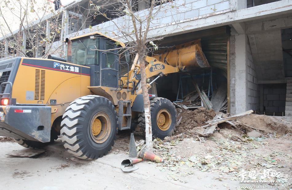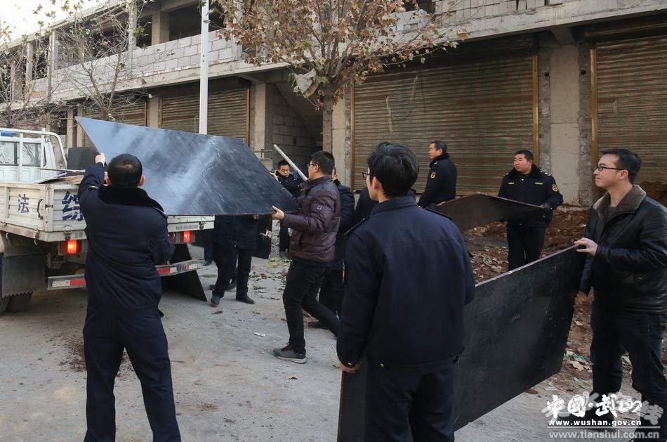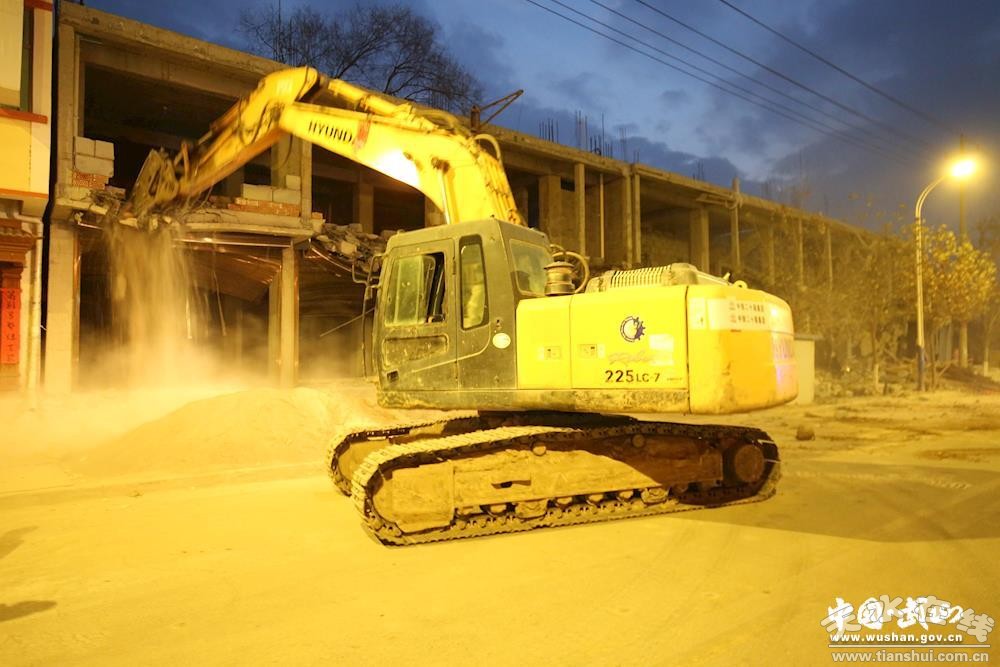 12月12日,武山县在多次劝阻无效、通告无效的情况下,组织县公安、国土、建设、环保、安监、执法、房管、交警、消防、司法、供电等单位和城关镇工作人员,依法依规对城区新兴路违法建筑进行了强制拆除。强行拆除违法建筑5户,拆除面积约2000平方米。拆除现场,县委、县政府领导亲自协调,靠前指挥,各相关部门和单位分工明确,责任到人,联动配合,整个拆除过程法律程序到位,执法秩序井然。