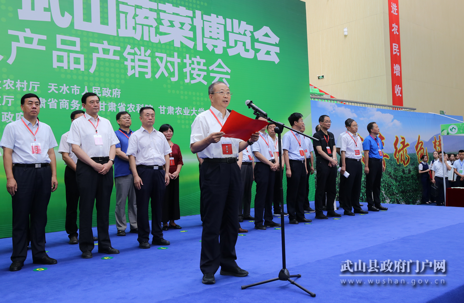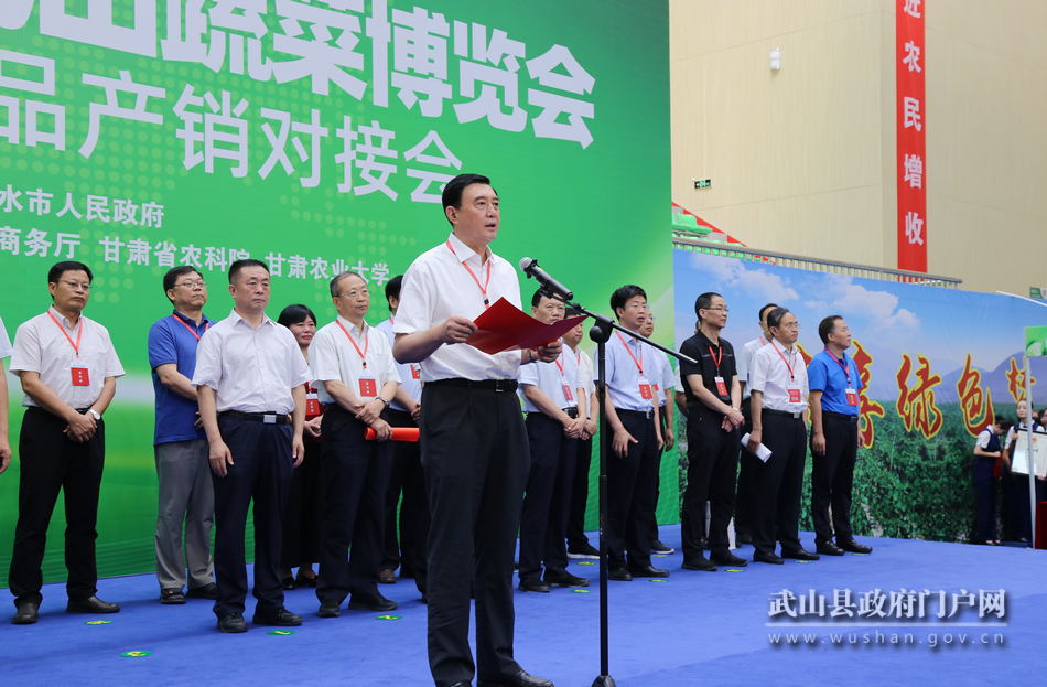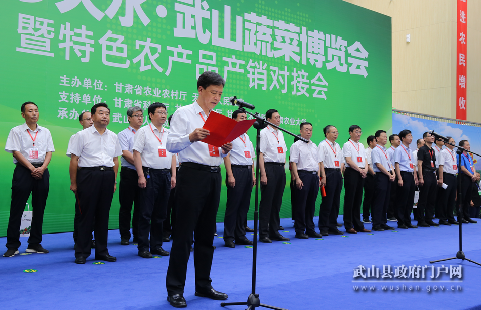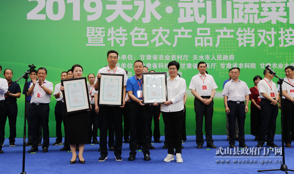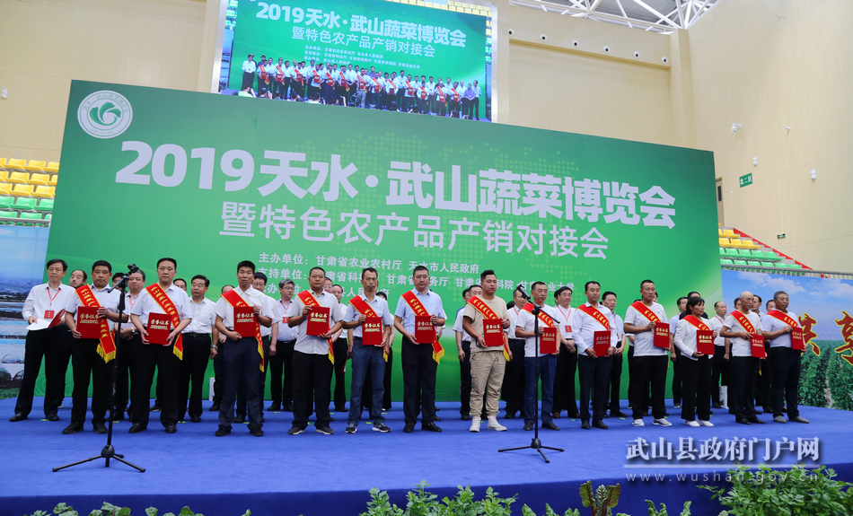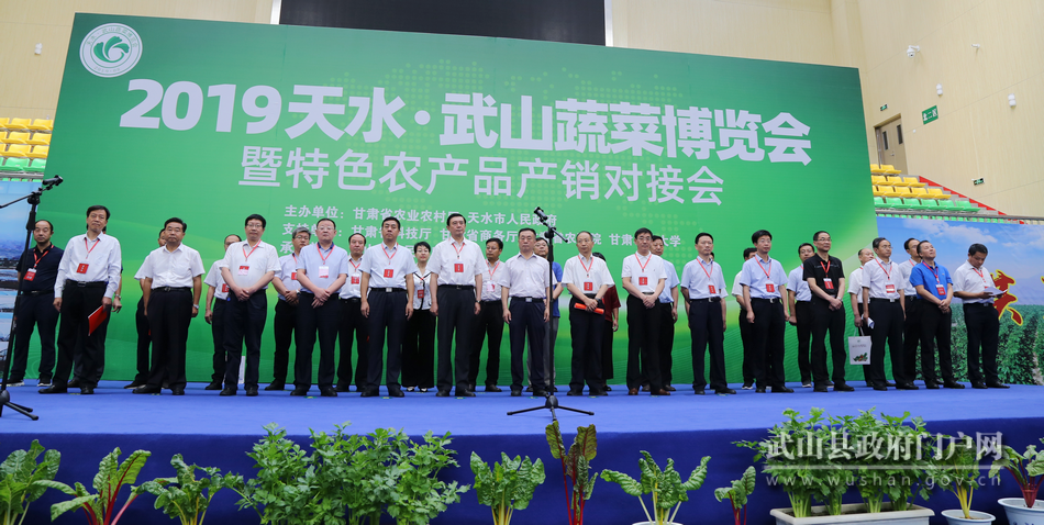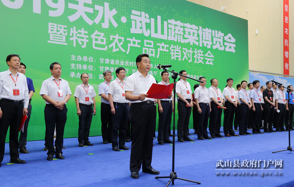 天水市人大常委会主任蒋晓强宣布2019天水·武山蔬菜博览会暨特色农产品产销对接会开幕;甘肃省农业农村厅党组成员杨祁峰、天水市委副书记赵卫东分别讲话;天水市政协副主席、武山县委书记索鸿宾致辞;武山县委副书记、县长马勤学主持开幕式;甘肃省市场监督管理局标准化处副处长张晓峰颁发“武山豆角”国家地理标志证明商标;甘肃省农业农村厅市场与信息化处处长武宏安颁发“武山莴笋”“武山辣椒”“武山油白菜”绿色食品A级产品证书;武山县委、县政府表彰了对全县蔬菜产业发展作出贡献的先进集体和先进个人。