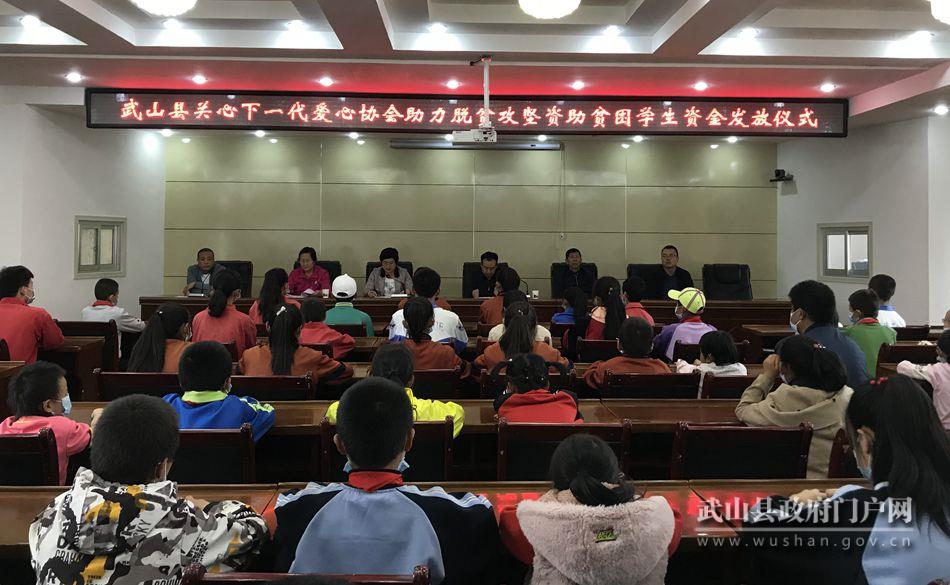 武山县融媒体中心6月2日讯(记者 王越) 6月1日,武山县关心下一代爱心协会举行资助贫困学生资金发放仪式,291名贫困学生领到资助金。副县长高春霞出席资助金发放仪式并致辞;县政协原主席、关工委主任颉卫星主持发放仪式。县政协原副主席、关工委副主任赵改萍,县人大常委会原党组成员、关工委副主任周幸生等,以及县委组织部、县教体局负责人,56名受资助贫困学生代表、所在学校的带队教师参加发放仪式。