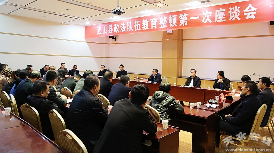 为坚持开门搞教育整顿,广泛听取各方意见建议,确保全县政法队伍教育整顿取得实效,3月11日,受市人大常委会副主任、武山县委书记、县政法队伍教育整顿领导小组组长索鸿宾同志委托,县委常委、政法委书记、县政法队伍教育整顿领导小组常务副组长林如海主持召开了县政法队伍教育整顿第一次座谈会。全县政法队伍教育整顿领导小组各成员单位负责人参加会议,座谈会邀请了人大代表、政协委员、企业家、律师、人民陪审员、特约监督员、案件当事人、干部群众等社会各界代表参加,听取代表们对全县政法工作和政法队伍以及政法队伍教育整顿的意见建议。