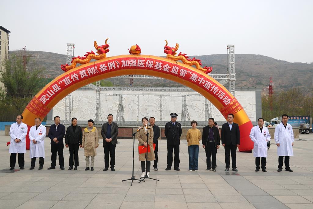 武山县融媒体中心4月21日讯(记者 康正东)4月21日上午,武山县在县人民广场组织开展“宣传贯彻《医疗保障基金使用监督管理条例》、加强基金监管”集中宣传集中宣传活动。县委常委、宣传部长胡丽霞出席集中宣传活动仪式并讲话,副县长金学民主持集中宣传活动仪式,县直相关部门、定点医疗机构、定点零售药店、金融单位相关负责人及工作人员300余人参加集中宣传活动。