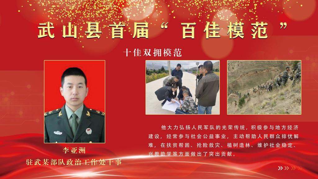 李亚洲,驻武某部队政治工作处干事。他大力弘扬人民军队的光荣传统,积极参与地方经济建设,经常参与社会公益事业,主动帮助人民群众排忧解难,在扶贫帮困、抢险救灾、植树造林、维护社会稳定、兴教助学等方面做出了突出贡献。