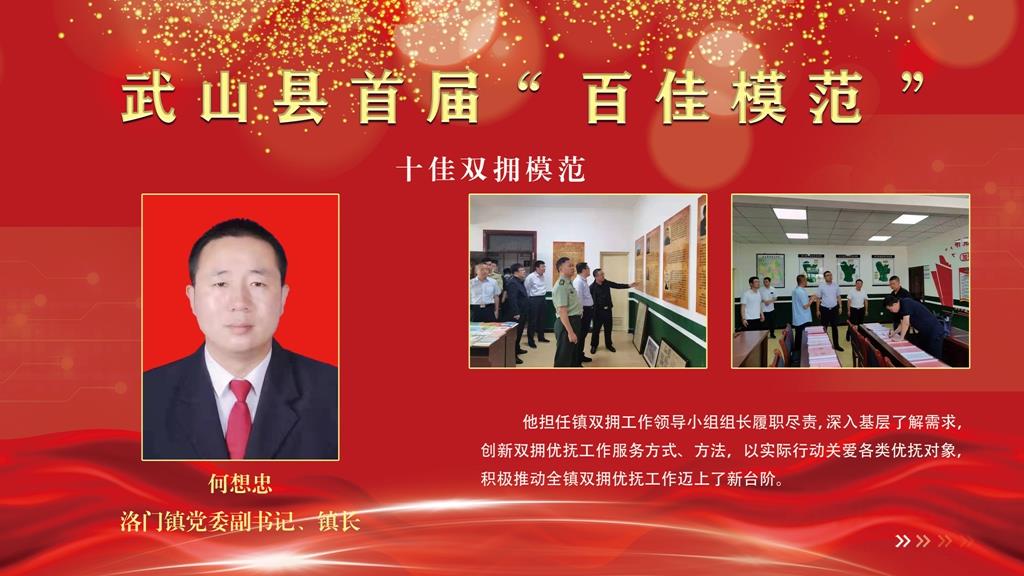 何想忠,洛门镇党委副书记、镇长。他担任镇双拥工作领导小组组长履职尽责,深入基层了解需求,创新双拥优抚工作服务方式、方法,以实际行动关爱各类优抚对象,积极推动全镇双拥优抚工作迈上了新台阶。