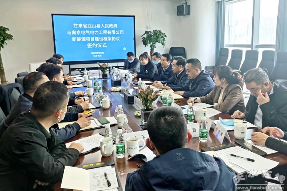 3月10日,天水市人大常委会党组副书记、副主任索鸿宾,武山县委书记王新强赴南京电气电力工程有限公司考察,与南京电气电力工程有限公司总经理姚汉卿就深化项目合作进行对接,并签订新能源项目建设框架协议。