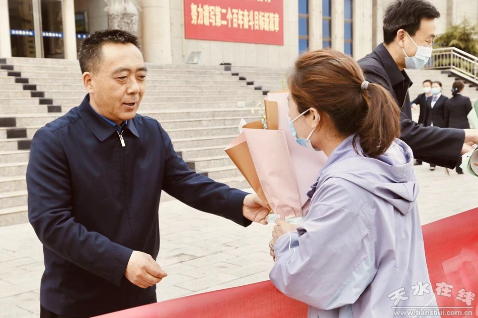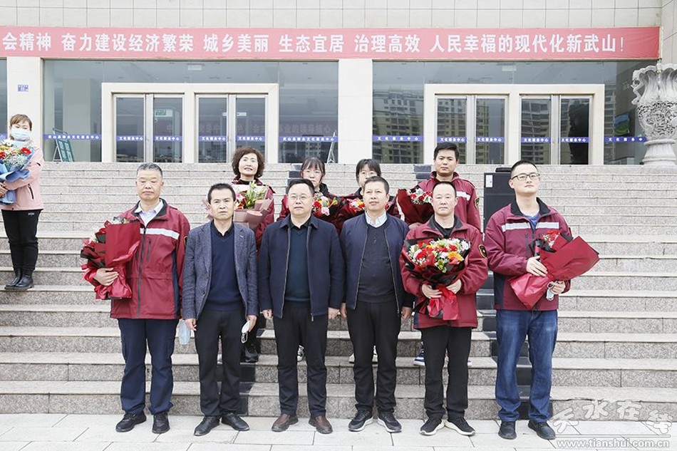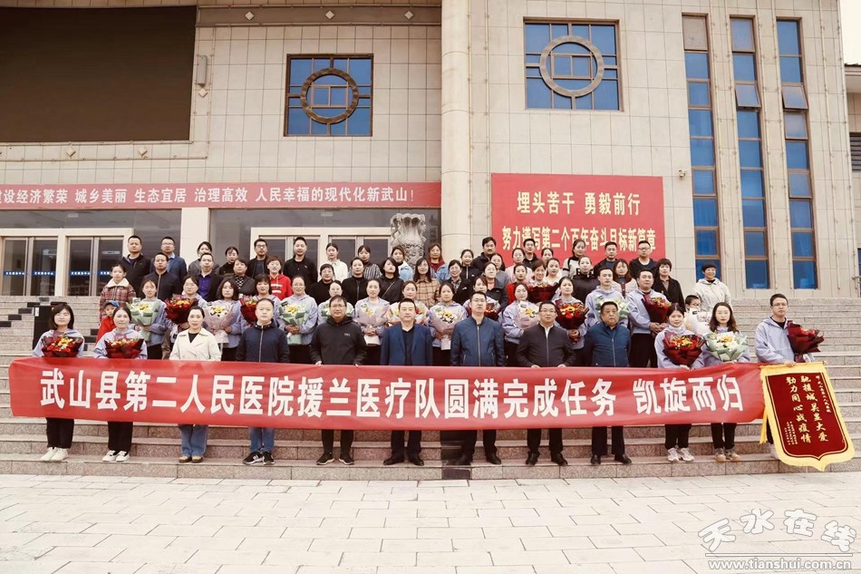 武山县融媒体中心4月16日讯 (记者车彤瑶 王继明) 春暖花开,英雄凯旋,白衣执甲,载誉归来。4月16日,武山县举行了支援兰州市50名抗疫人员欢迎仪式。县委书记王新强出席仪式并讲话,县委常委、政法委书记令军强,县委常委、宣传部部长胡丽霞,县委常委、副县长石云及县直相关部门负责人和医疗机构负责人参加仪式,副县长李峰主持仪式。仪式上,武山县支援兰州市医疗队队长颉春丽代表50名医务人员作了发言。
