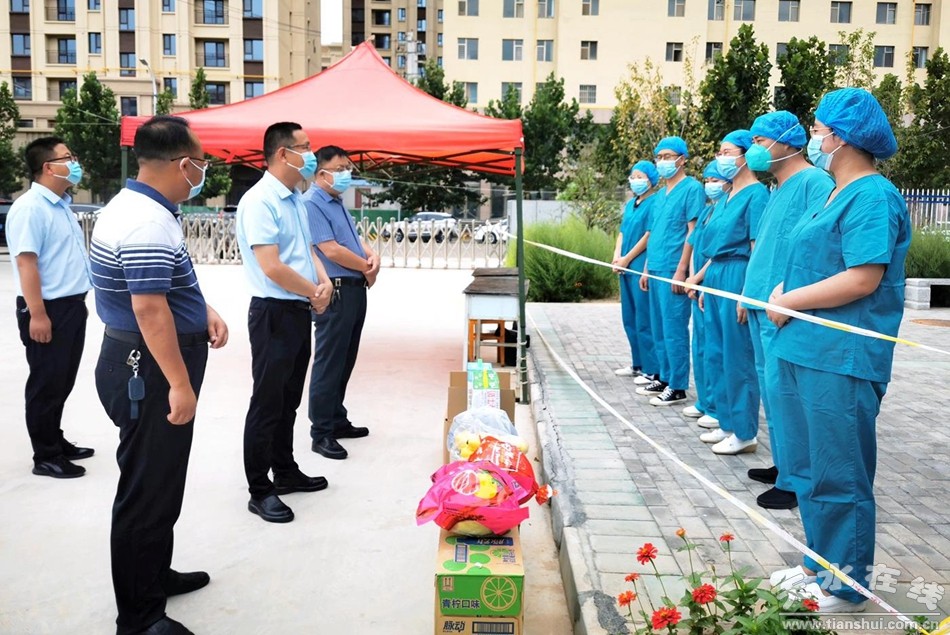 武山县融媒体中心8月19日讯(记者 李益)8月19日,副县长李峰来到县人民医院和县政府招待所、县委党校隔离观察点等地,看望慰问奋战在医疗一线的医务工作者,并通过他们向全县广大医务工作者致以节日问候和崇高敬意。