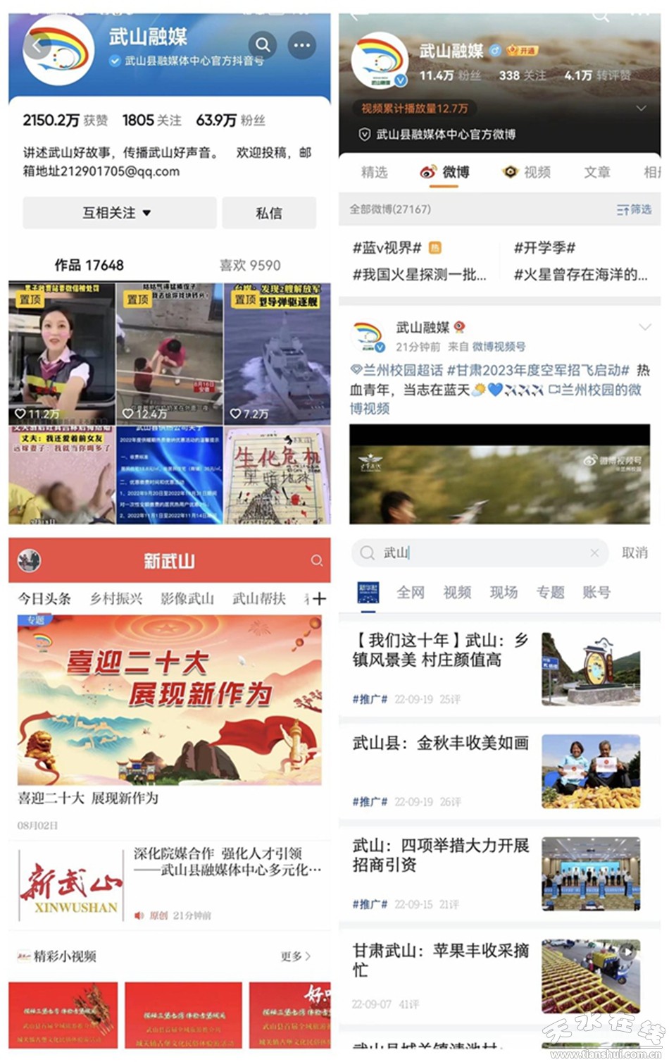 采编力量的增强,专业人才的融汇,让 “武山融媒”的传播力和影响力持续提升,舆论主阵地作用进一步凸显。截至目前,各平台共发布各类稿件15万余条,总阅读量超10亿次。新武山客户端下载量达5.7万余人次,占常住人口数的16.8%;武山融媒抖音号粉丝数63.9万,获赞2149.8万;武山融媒微博粉丝量近12万;武山融媒头条号粉丝数10.6万,获赞427.9万,新华号阅读量百万以上作品60余部,各平台利用各自优势开展新闻报道、信息发布、直播宣传等,全县新闻宣传工作质量稳步提升。
