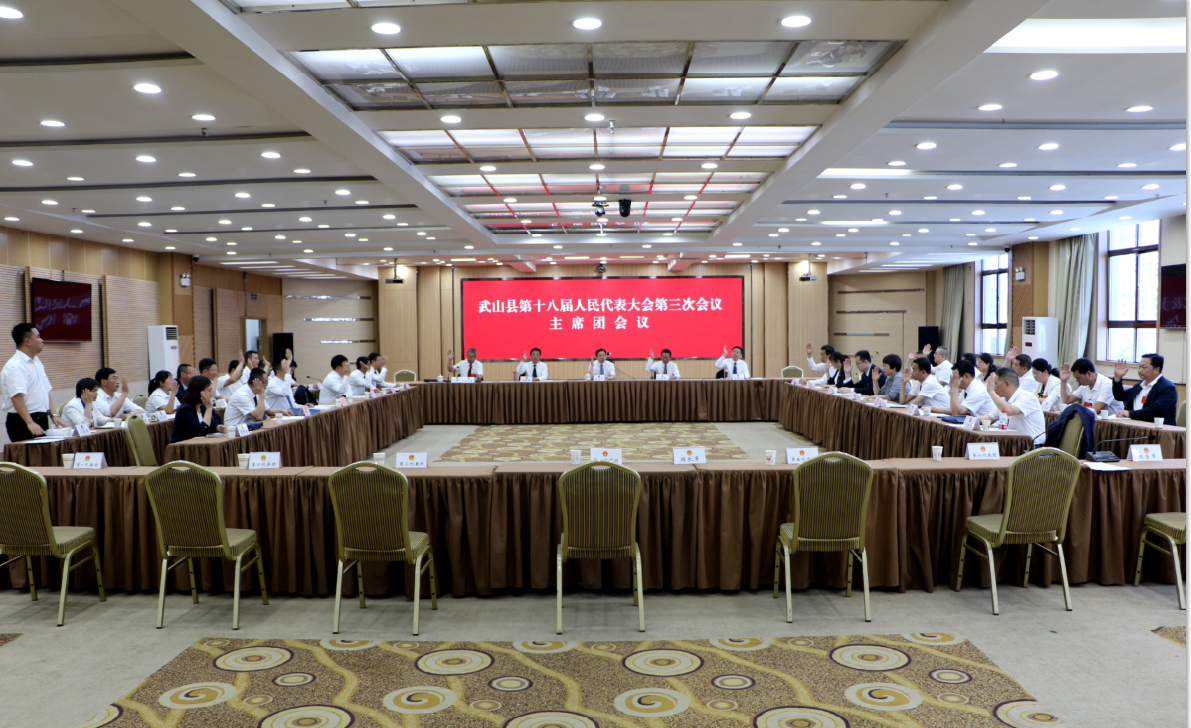 6月14日下午,武山县第十八届人民代表大会第三次会议召开主席团第二次会议。县人大常委会副主任骆育喜主持会议。会议应到主席团成员39名,实到35名,请假4名,符合法定人数。