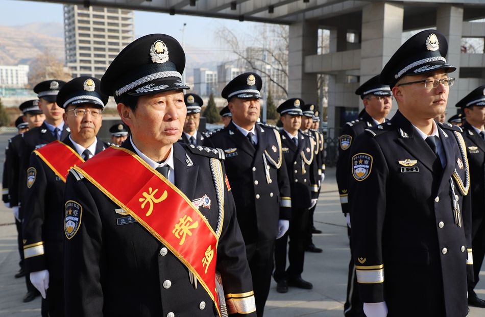 上午10时整,护旗队标兵精神抖擞,迈着铿锵有力、整齐划一的步伐走向升旗台。“升警旗!”“奏唱中国人民警察警歌!”随着号令,擎旗手挥臂扬旗,伴随着《中国人民警察警歌》振奋激昂的旋律,中国人民警察警旗迎着朝阳冉冉升起,全体民警着装整齐、列队肃立、向警旗庄严敬礼,以此表达对公安事业的无限忠诚和热爱。警旗猎猎、誓言铮铮,全体民警重温入警誓词,进一步增强了忠诚履职尽责的使命感,彰显对公安事业的无限忠诚与热爱。升旗仪式后,举行了庄重的退休民警纪念章颁授仪式,并为新警代表授了警衔。参加仪式的各位领导,局党委班子成员及局属各部门负责人观看了2023年公安重点工作大盘点视频片。