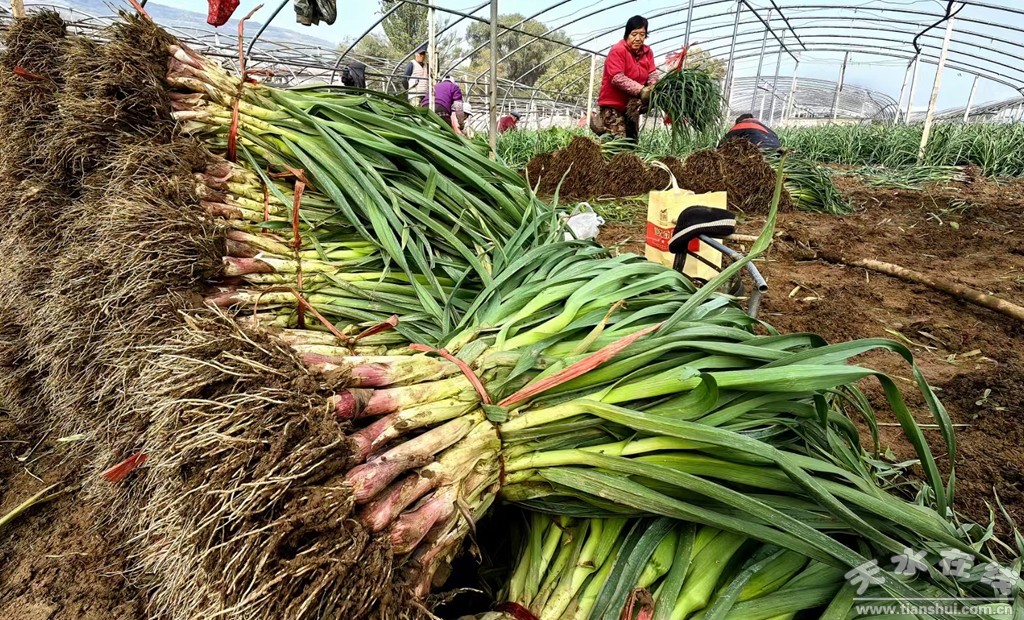 当下,走进武山县洛门镇大南河流域蔬菜标准化种植示范基地,一垄垄蒜苗翠绿挺拔、根红叶绿,长势十分喜人;村民们正熟练地将一捆捆鲜嫩的蒜苗收割、打捆,田地里呈现出一派热火朝天的丰收景象。