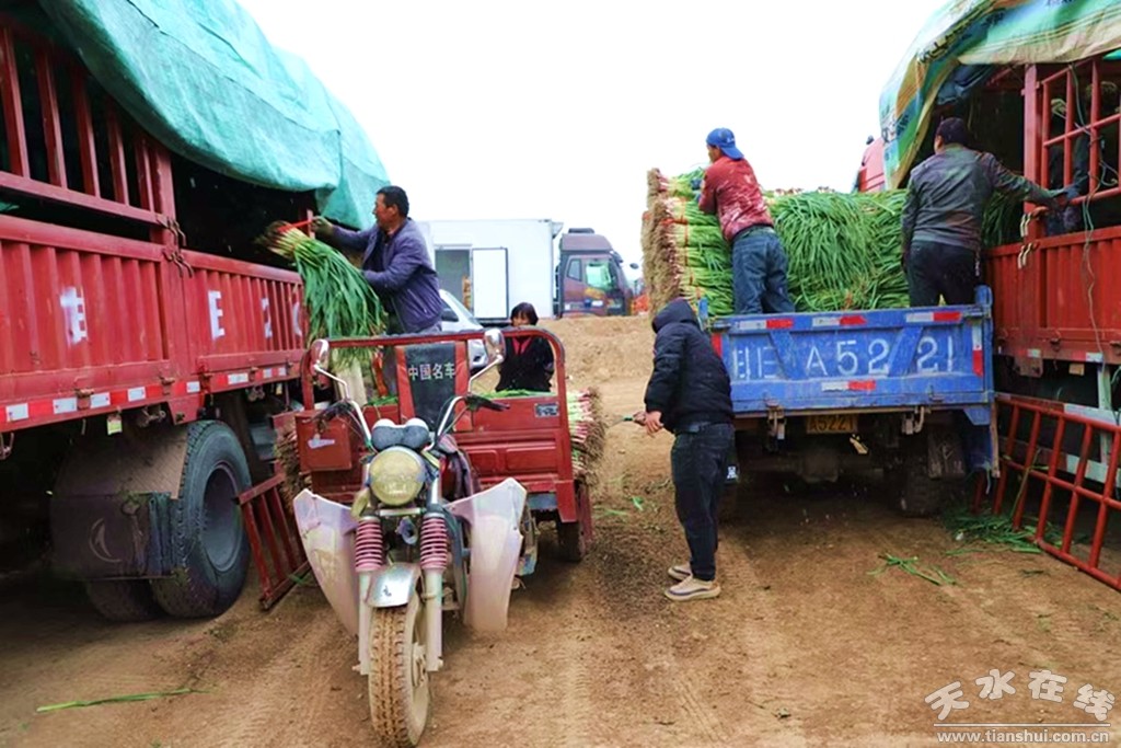 在洛门镇大南河蔬菜交易市场,一辆辆满载蒜苗的车进进出出,收购商们忙着称重、装车,准备将这些新鲜的蒜苗运往全国各地。“武山的蒜苗品质好,在市场上很受欢迎,我们每年都会来这里收购。今年的行情也好,最低价都每斤两元以上了,我们的收购量预计比去年增加不少。”一位来自西宁的收购商王先生说。