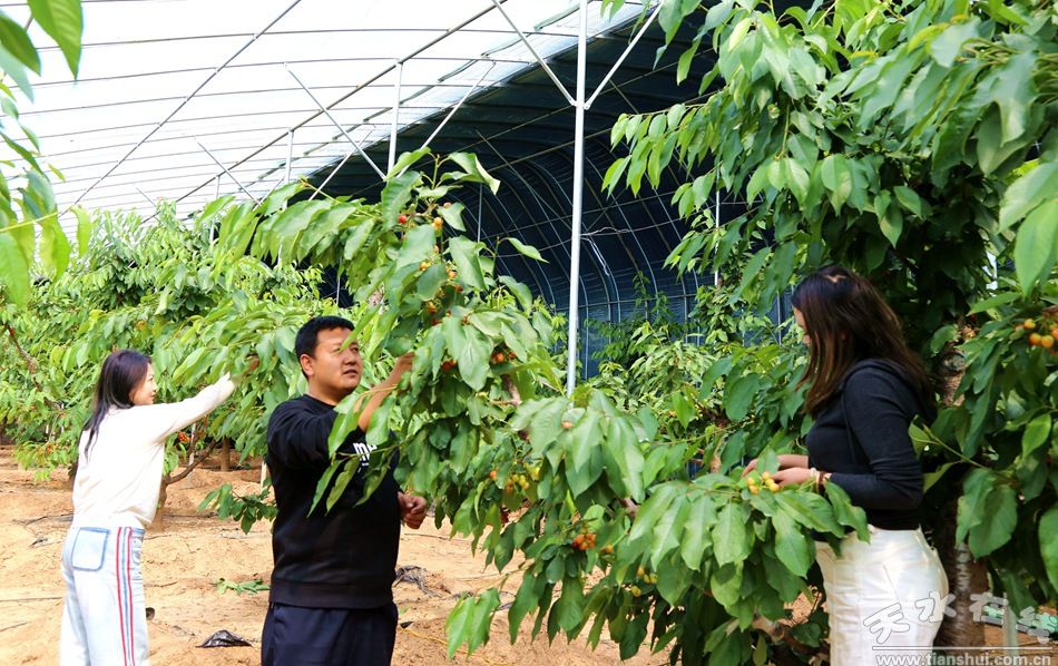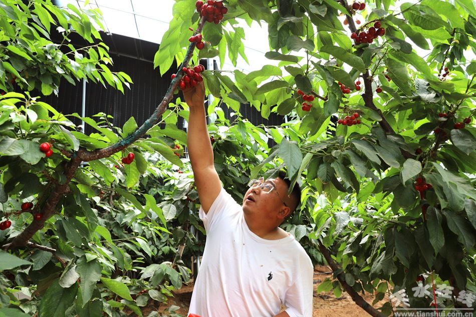 初夏时节,走进天水市武山县四门镇三衙村樱桃种植示范园,一颗颗晶莹剔透的樱桃挂满枝头,如红宝石般在绿叶间闪烁。果农们穿梭在果树间,熟练地将成熟的果实采摘入篮,脸上洋溢着丰收的喜悦。