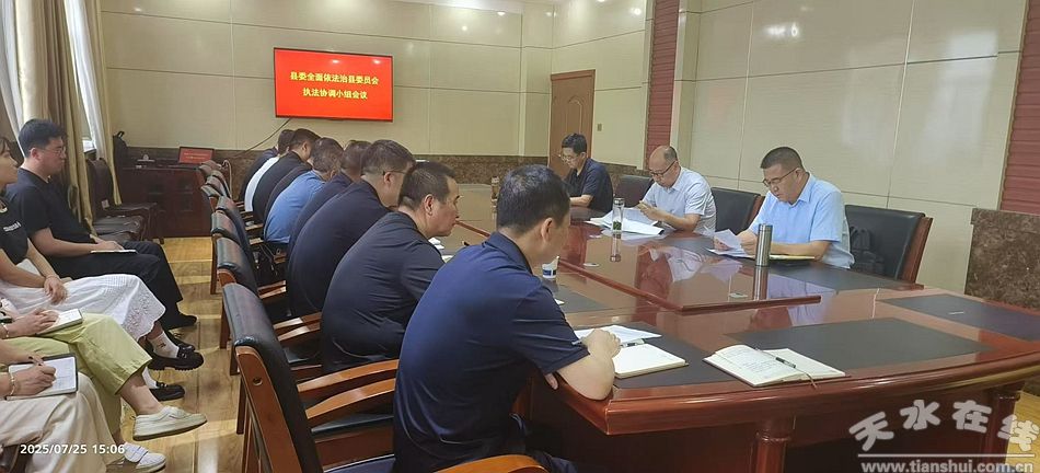 7月25日,武山县召开县委全面依法治县委员会执法协调小组会议,副县长、县委全面依法治县委员会执法协调小组组长谢怀东主持会议并讲话,县执法协调小组各成员单位负责人及执法队长参加会议。