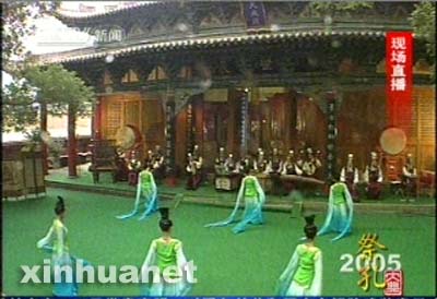 7时46分,武威文庙的祭孔活动正式开始,随后,祭孔的画面出现在中央电视台新闻频道的直播节目中。浩浩荡荡的祭典队伍通过状元桥朝供奉着孔子像的大成殿进发。今年武威祭祀大典是按照清朝皇帝祭孔的议程进行的,祭祀的队伍服饰非常讲究,手执龙旗的八位旗手走在队伍的最前面,然后是长号演奏员,中间手拿长翎的是舞蹈演员。队伍的最后是皇帝、宰相和六部大臣。伴随着威武雄壮的号角声,皇帝和诸位大臣在大成殿前面向孔子敬香,并行三拜九叩大礼。随后,由武威1000多名孔子后代中选出的近60名代表按照辈分大小依次站成四排,在武威孔子宗亲会会长的带领下进行家祭。在武威祭孔直播节目的最后,武威文庙祭孔中最精彩、最具特色的项目——孔子六艺乐舞演出的画面出现在中央台新闻频道的直播节目中,“孔子六艺乐舞”分六个章节来表现孔子所倡导的“礼、乐、射、驭、书、数”六艺。在“乐”这一章中,身着长袖衣衫的女孩子如敦煌壁画中的飞天般在悠扬的乐曲声中翩翩起舞,动若天女下凡,静若清泉流水,舞蹈中穿插的收袖及单手在背后甩袖的动作就是典型的西凉乐舞的风格。人们熟知的杨贵妃的霓裳羽衣曲就是在西凉乐舞的动作基础上演绎而来的。这次表演的孔子六艺乐舞是根据当?
