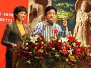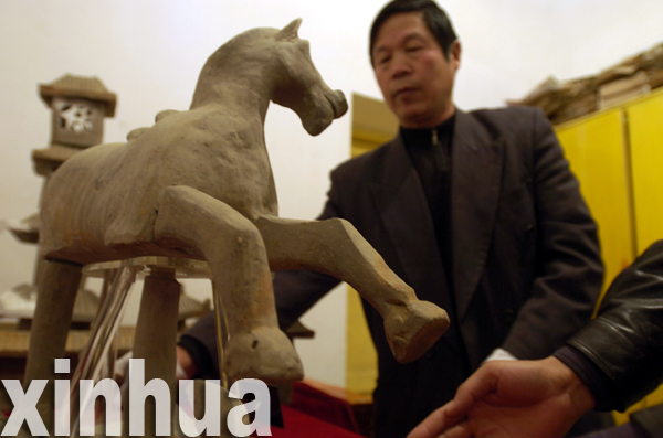 10月25日,武威市考古研究所工作人员在展示出土的陶奔马。2007年5月,武威市文物考古研究所在该市城郊发掘一座魏晋时期墓葬时,出土一件陶奔马。这件陶奔马长58.5厘米,高42厘米。这件陶奔马与1969年武威雷台汉墓出土的铜奔马相比,除了材质和大小略有不同外,在造型上十分相似。据介绍,陶奔马的出土地与举世闻名的铜奔马出土地相距不到3公里。