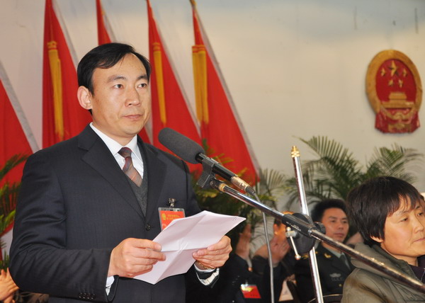 (全票当选的张家川县人民政府县长马中奇作表态发言)
