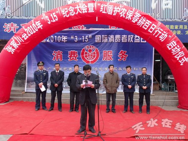2010年3月15日,张家川县在人民路十字举办了规模宏大的“3.15国际消费者权益日”宣传庆祝活动,县委常委、常务副县长李肖锋,县人大副主任王九仲,县政协副主席马中华和县委宣传部、县文明办、县工商局、县质监局、农业局等15个相关部门及部分企业、个体工商户代表应邀参加了纪念大会。