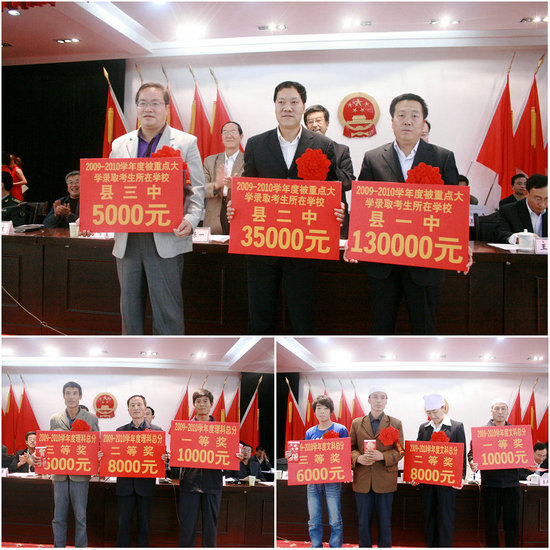 会上,县四大组织领导为获得2010年度“县园丁奖”的100名优秀教师、10名先进集体和在2010年度全县高考、中考及录取中取得优异成绩的先进单位和先进个人分别颁发了奖金奖牌。县委常委、宣传部长关春生宣读了《中共张家川县委、张家川县人民政府关于表彰奖励2010年度教育工作先进集体和优秀教师的决定》;副县长马玉凤宣读了《中共张家川县委、张家川县人民政府关于2010年高考表彰奖励的决定》。县三中、闫家中学负责人及获奖优秀教师代表在会上分别作了表态发言。