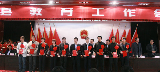 县委书记刘长江在会上作了重要讲话(全文另发)。他指出,一年以来,全县上下始终把教育放在优先发展的战略地位,以办人民满意的教育为目标,进一步整合教育资源,坚持不懈地推进教育改革,狠抓了教育教学质量,促进了教育事业的持续快速健康发展。主要表现在:一是加大基础设施建设力度,办学条件不断改善。千方百计加大教育投入,想方设法改善办学条件,千方百计筹措资金完善县一中后续工程建设,全面完成了县二中综合楼、教师公寓楼和县职业学校的综合教学楼、学生公寓楼建设,在全县13所农村中学实施了集中供暖工程,全县校舍安全工程稳步开展,县城新建初级中学前期工作进展顺利。二是完善考评机制,教师队伍建设不断加强。城区学校严格推行凡进必考制度,激发了广大教师的工作积极性。加强校长、教师业务学习培训,广泛开展师德创建和技能提高活动,全县涌现出一大批省、市、县优秀教师、业务骨干和学科带头人,教师队伍结构和整体素质得到了优化和增强。三是顺利完成新一轮校长聘任工作,校长队伍不断优化。采取竞争性选拔的方式,在全县范围内选拔了8名中小学校长,使一批年富力强,具有一定教学能力和管理经验的教师走上了管理岗位。四是各类教育均衡发展,教育教学质量不断提升。高度重视幼儿教育,巩固发展义务教育,强化高中教育,大力发展职业教育,积极推进新课改和素质教育,教学质量大面积提高,特别是今年高考取得较好成绩,各类本科上线人数达到589人,比去年增加了49人,大专以上录取总人数达到1704人,创历史新高。这些成绩的取得,不仅有效吸引了全县优质生源,减少了外流情况,更增强了全县上下对教育发展的坚定信心。