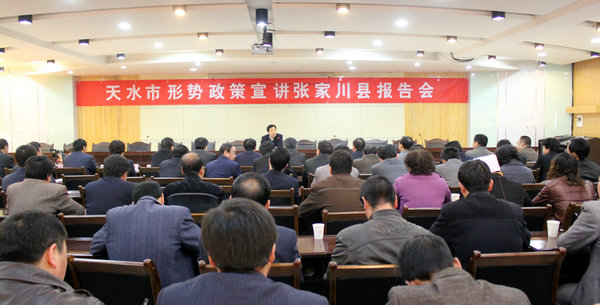 天水市经济现状如何?天水市经济发展面临的历史机遇有哪些?“十二五”期间天水市总体发展思路是什么?……4月12日上午,天水市委宣讲团在张家川回族自治县行政大楼八楼会议室一场题材新颖、内容丰富的形势政策报告会,让张家川县与会领导、县直部门负责人对天水市形势政策有了一个全新的认识。