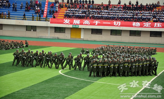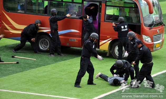 劫持人质反恐演练(图为反恐处突队员全部到位开始实施强攻)