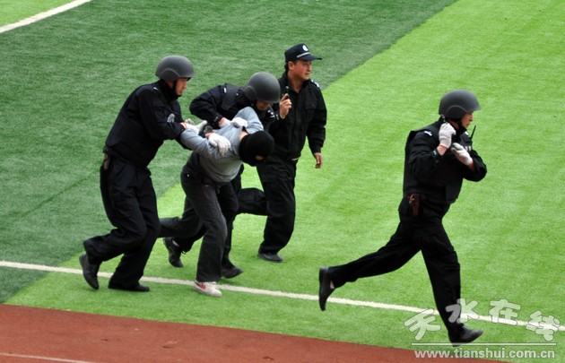 劫持人质反恐演练(图为恐怖分子被突击队员当场制服)